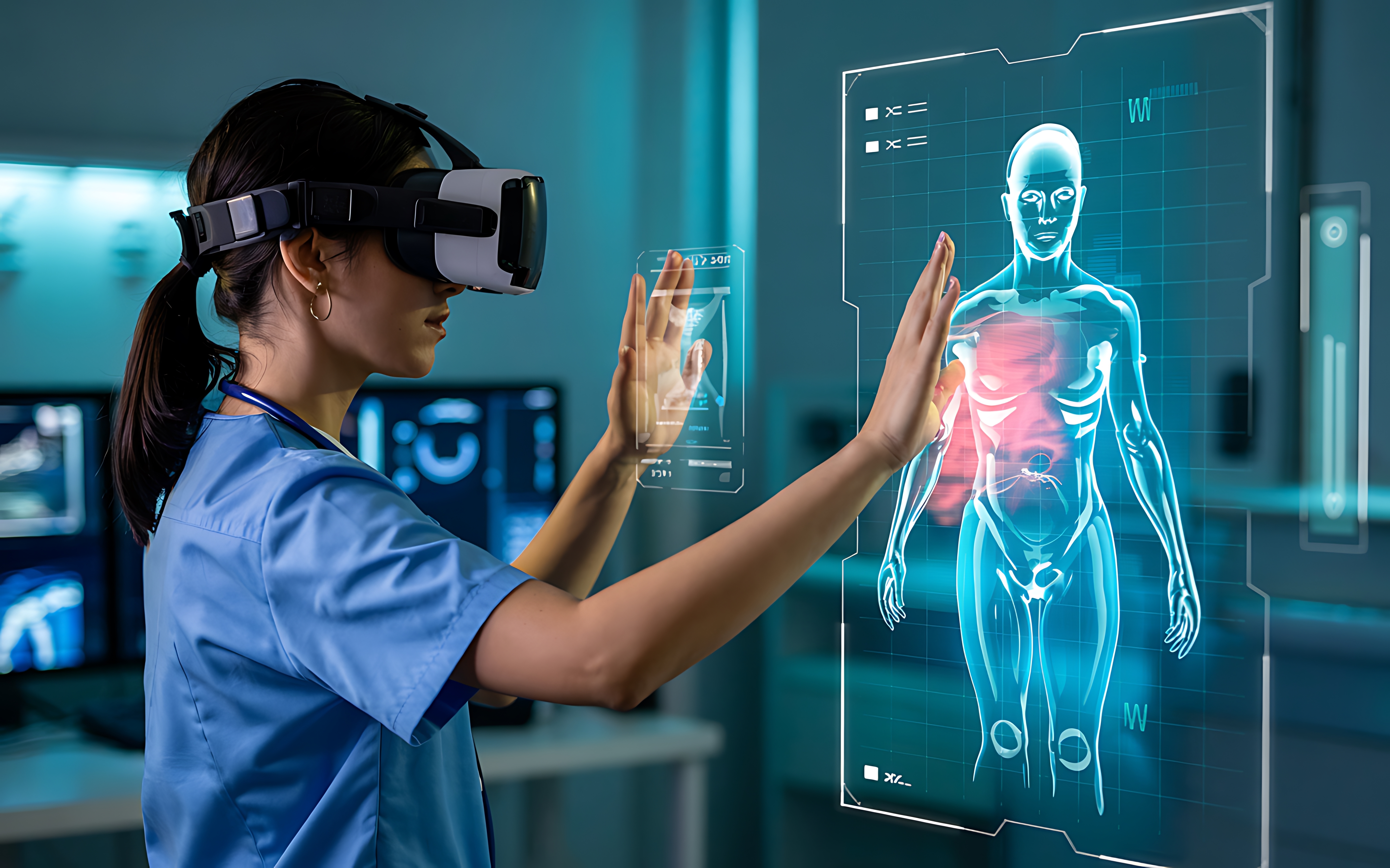 Augmented Reality (AR) in healthcare can enhance training, realistic surgical planning, mental health treatment, patient education, and rehabilitation by overlaying digital information (such as 3D anatomy, vital signs, or instructions) onto the real world. This can improve precision for surgeons, engagement for students, and understanding for patients, while also enabling remote collaboration and accurate wound assessment, all in a fully immersive, completely artificial digital environment.