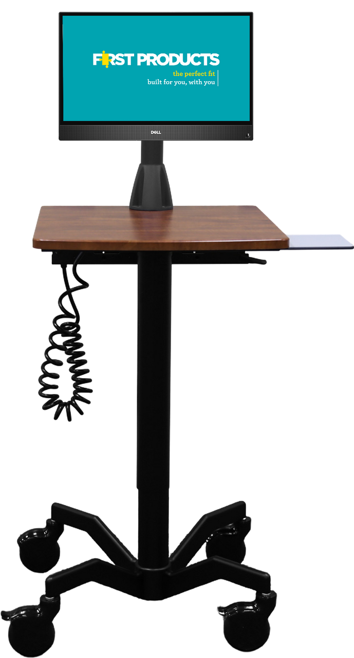 A sleek, height-adjustable mobile desk designed for laptop users who need flexibility and mobility in any work environment.